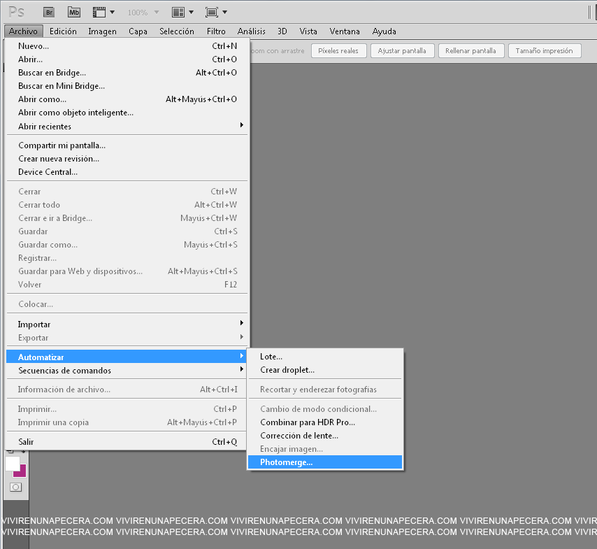 Una vez que tenemos abierto como digo ya empieza lo divertido, en concreto se va a usar la función Photomerge, es una de esas funciones de Photoshop que está por ahí escondida, me parece que solamente las últimas versiones traen esta función, yo uso Photoshop CS5, pero creo que el 4 lo trae, no estoy segura.
